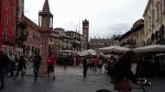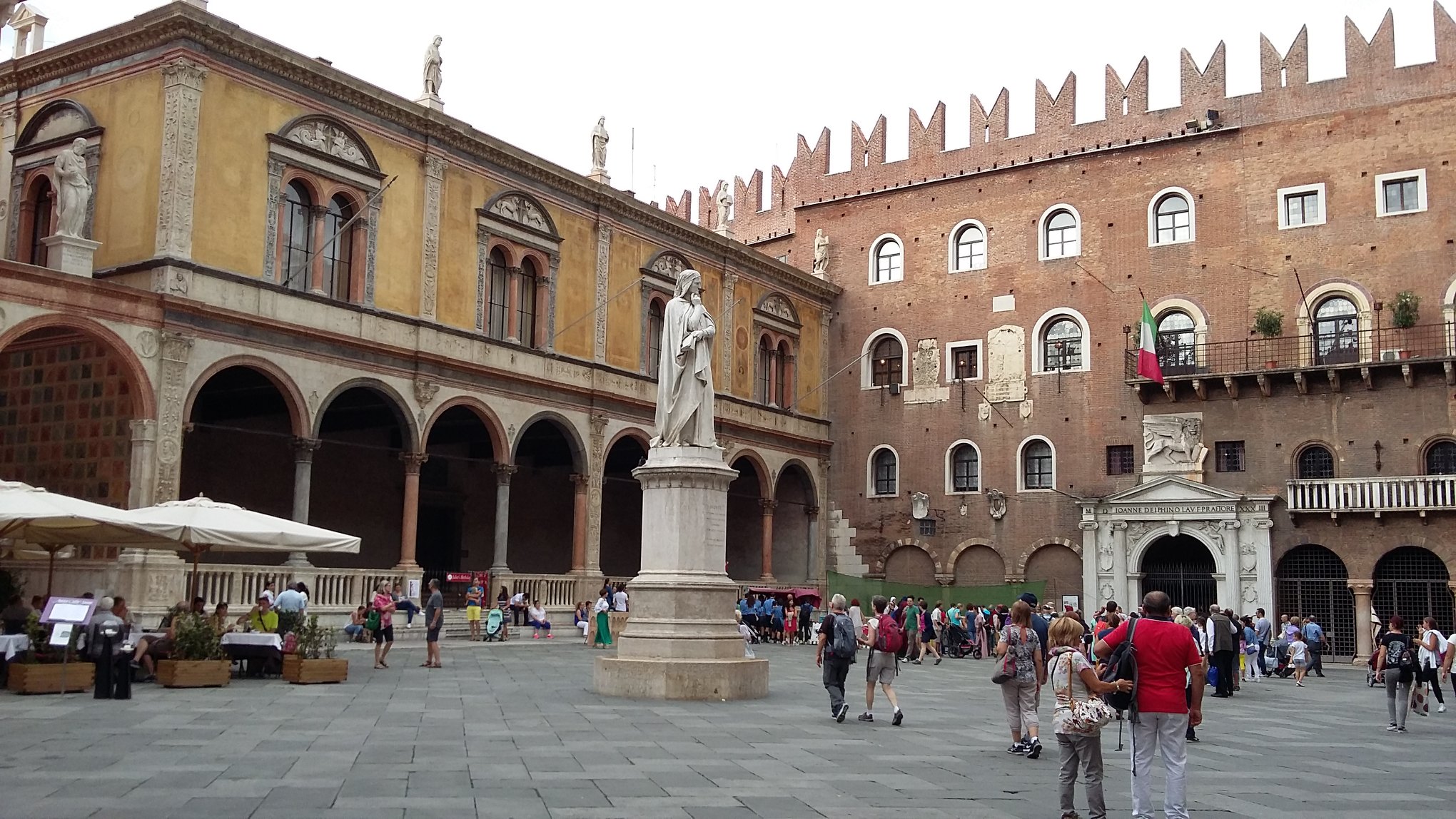 Ci siamo quindi diretti verso una parte della piazza occupata dal retro della Domus Nova e il prospetto laterale neoclassico del Palazzo della Ragione o del Comune, in mezzo ai quali è appoggiato l’arco della Costa (così chiamato per la presenza, dalla metà del ‘700, di una costola di balena che pende dalla volta) da cui ci si immette in Piazza dei Signori. Sulle due piazze svetta la Torre dei Lamberti. Al centro della piazza di trova il monumento a Dante (1865), una statua di 3 metri in marmo bianco di Carrara, eretta in occasione delle celebrazioni del sesto centenario della nascita del poeta, che presso la corte di Cangrande trovò il suo primo rifugio dopo l’esilio da Firenze.