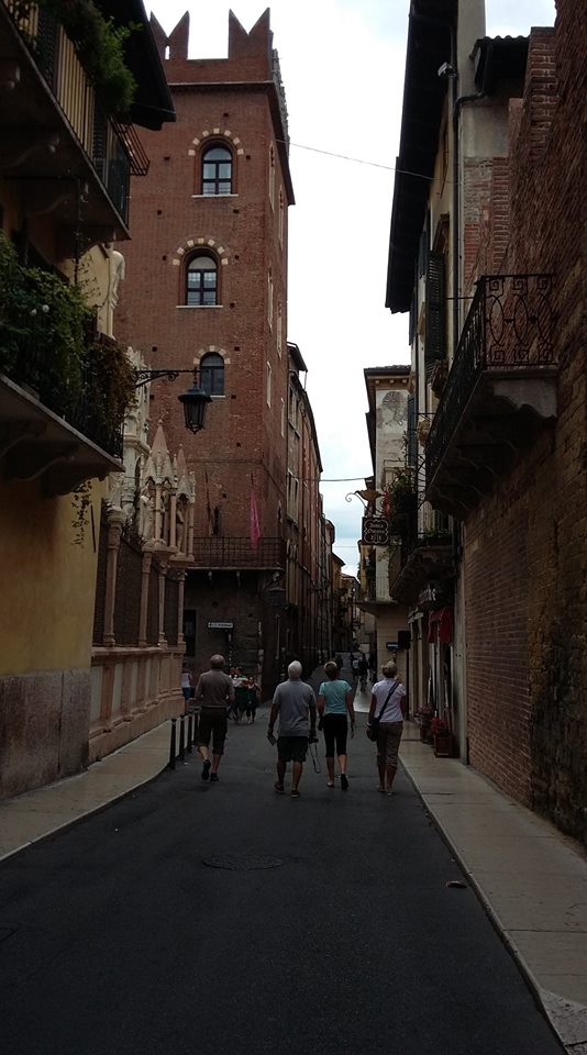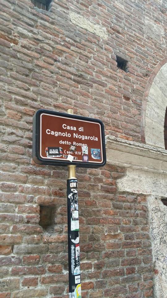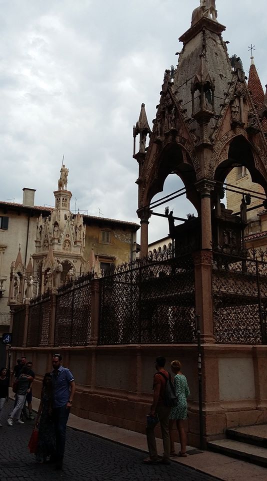 Abbiamo quindi deciso di seguire le orme di Romeo e Giulietta. E proprio lì, dietro il palazzo dei Signori ci siamo diretti verso le Arche Scaligere, il complesso funerario recintato da ferro battuto, con ricche decorazioni su cui spicca il motivo della scala (simbolo dei signori). E più giù in via Santa Maria Chiavica ci siamo imbattuti nella poco battuta casa di Romeo. Nell’abitazione medievale ha abitato Cagnolo Nogarola. È una sorta di castello urbano, segno dell’importanza della famiglia, e presenta tuttora murature in cotto merlate alla sommità nel cortile cintato verso la strada e nei resti di una torre angolare.