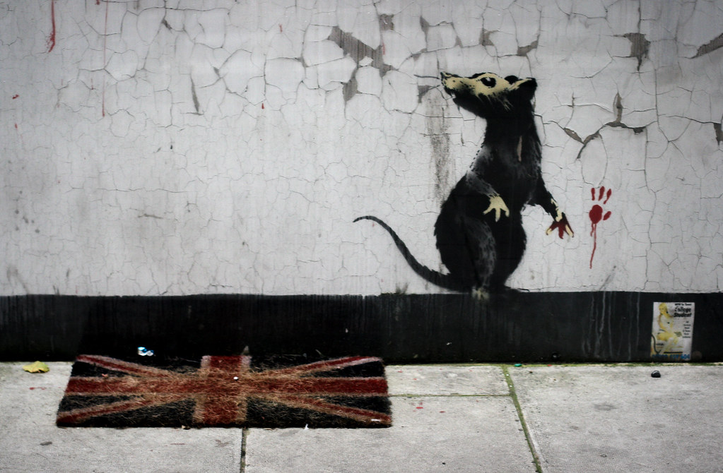 Se nei primi anni della sua attività amava realizzare dipinti famosi con l’aggiunta di particolari anacronistici, oggi, per lanciare il proprio messaggio, si affida al murales. Ha realizzato per tutta Londra stencil di topi, i famosi Rats, opera che se da una parte mette in evidenza le specificità della realtà attuale, dall’altra vuole porre l’accento sull’anagramma della parola rat, da cui si può ottenere art (“arte”). Ha scelto i topi perché sono animali odiati, cacciati e perseguitati, eppure capaci di mettere in ginocchio intere civiltà. Per Rats si intende una serie di graffiti realizzati dall’artista Banksy raffiguranti dei topi, intenti alle più svariate azioni. I primi Rats sono apparsi per le strade della città nativa dell’artista. Successivamente le piccole bestiole hanno infestato grandi città come Londra, Parigi, New York. Banksy ha raffigurato molti topi a Londra aventi un cartello in mano con i più svariati messaggi, dal simbolo della pace, al simbolo dell’anarchia, a un semplice messaggio “I <3 London”.
