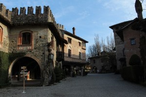 Il parco è costituito da alberi secolari, statue, viali e fontane, mentre all’esterno sorgono edifici rispondenti in tutto alle linee stilistiche dei primi secoli dopo il 1000. I rapporti architettonici sono infatti armoniosi e piacevoli e i vari elementi dell’arredo urbano, come fontanelle, balconi, finestre, colonnine, stemmi e iscrizioni, sono collocati seguendo lo stile classico e armonioso dei primi secoli dopo il mille. Le vecchie case oggi ospitano negozi, ristoranti, bar e piccole botteghe artigiane capaci di creare atmosfere sognanti. Il borgo inoltre si popola in occasione delle numerose manifestazioni programmate, come Halloween, le gare di arcieri, il corteo storico e gli eventi legati a Harry Potter.