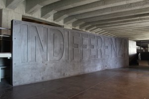 Il monito dell’indifferenza accompagna l’intera visita, dal momento che risuona come un’eco impazzito tra le testimonianze dei deportati, tra le assi dei treni, all’interno del luogo della meditazione, in un universo fatto di domande e di come l’olocausto sia stato possibile. Una volta superata la scritta, il visitatore può prendere la rampa sospesa che collega l’atrio di ingresso con il piano rialzato. Lungo il tragitto può affacciarsi per osservare le biblioteca.