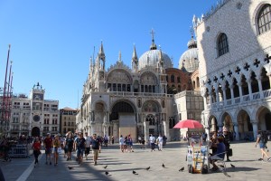 Proseguendo vi troverete davanti a piazza San Marco. Ogni anno accoglie le coloratissime maschere di carnevale, ed è di fatto considerata il salotto della Venezia bene. Circondata dagli edifici più importanti della città come la Basilica di San Marco, il Campanile, Palazzo Ducale e i suoi colonnati che raccontano la grandezza della Serenissima, la piazza viene ricoperta di acqua quando la marea supera i 90 centimetri.