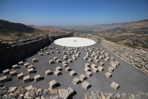 Il teatro è infatti costituito da 108 doppi cubi di pietra che, visti dall’alto, hanno forma di stelle a otto punte, giacciono sparsi davanti al proscenio. La loro posizione altro non è che la proiezione terrestre di quella costellazione di Andromeda. A ispirarlo è stata la teoria scientifica, e l’immagine poetica, di una futura collisione fra la galassia di Andromeda e la Via Lattea “che si vanno incontro a 500mila km al secondo e finiranno col fondersi. Un evento lontano nel tempo ma che io immagino come la finalità ultima di tutto”.