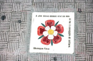 Passo dopo passo è possibile ricostruire la memoria civica in “un susseguirsi di simbologie e rimandi che possano contribuire a far “inciampare” e riflettere gli spettatori-visitatori”, come è scritto sul sito di Casa memoria. Il 9 maggio 2012 sul marciapiede è possibile vedere le prime pietre di memoria con le frasi di una poesia di Peppino.