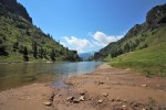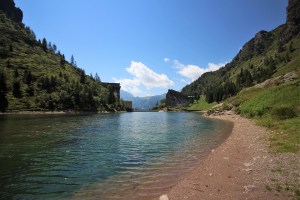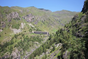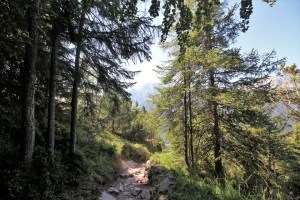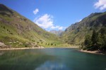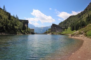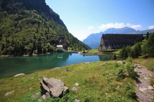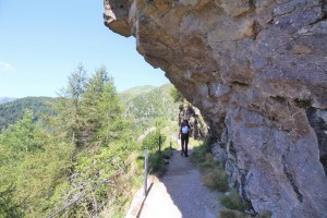 Si prosegue e dopo aver imboccato il sentiero di sinistra si arriva nel punto in cui si vedono i tubi della condotta forzata. Una volta arrivati a questi punto si prosegue lungo la mulattiera fatta di pietre e tornanti. Nel giro di circa 20 minuti si arriva a quota 1500 metri. Dopo i tornanti la strada diventa pianeggiante e porta nel tratto scavato nella roccia e a strapiombo sulla valle. Si prosegue e nel giro di poco tempo si raggiungono i ruderi della diga e il laghetto.