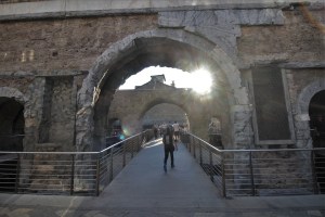A pochi metri dalla Porta si trova il maestoso Teatro Romano, con la sua facciata alta 22 metri. Il proscenio di 45 metri per 7 di profondità e le estese gradinate potevano ospitare fino a 4000 spettatori. Oggi ospita eventi culturali. Quel che resta dell’Anfiteatro è inglobato nel Convento di Santa Caterina.