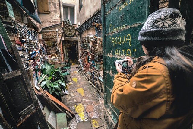 Accanto alle librerie che ho visitato ne esistono altre che per diversi giornali sono i negozi di libri più belli al mondo. Tra questi c’è “Acqua alta” a Venezia. Si trova in un vicolo poco affollato vicino a Piazza San Marco e si affaccia su uno dei tanti canali che scorrono nella città. È il 2004 quando Luigi Frizzo, vicentino di origine ma veneziano d’adozione, apre la libreria che si potrebbe definire come una sorta di micro cosmo, perché fatta di libri, arredi e gatti. Al suo interno potrete trovare barche e gondole sulle quali sono sistemati i libri che altrimenti verrebbero letteralmente sommersi dall’acqua.