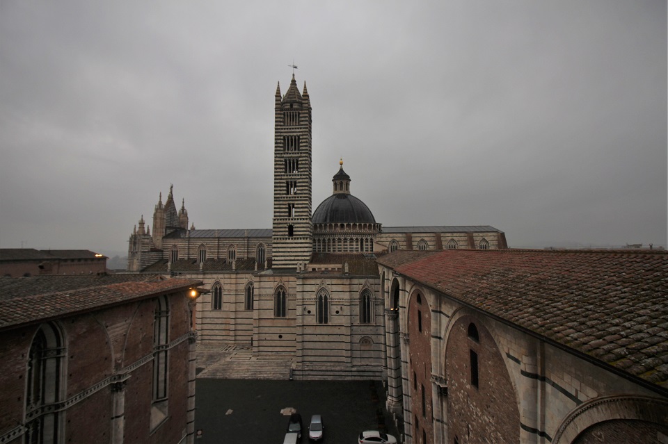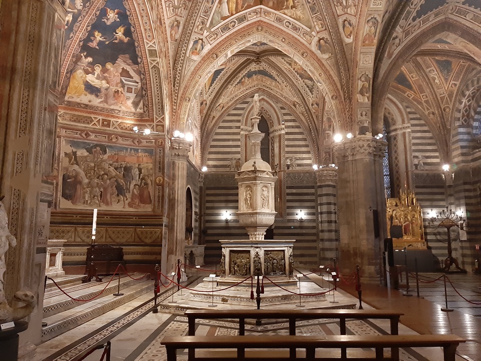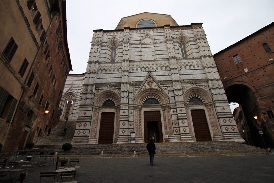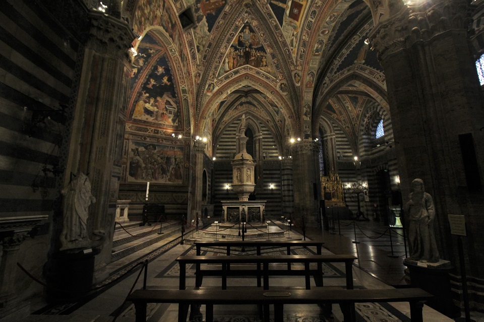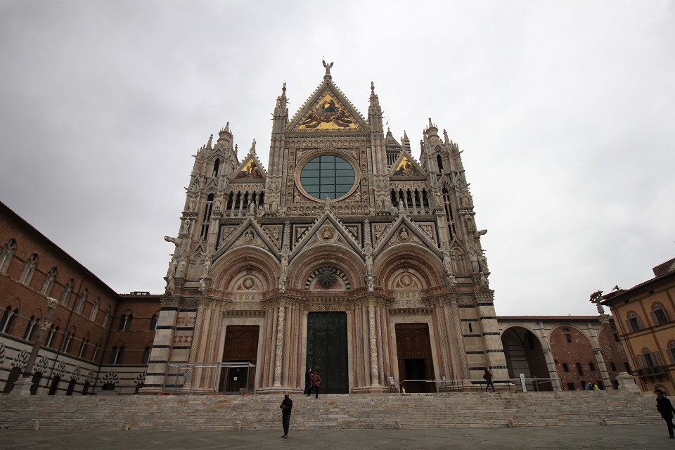 Ancora con la maestosità di piazza del Campo e del Palazzo Pubblico negli occhi, si passeggia tra le vie e una volta arrivati nello spiazzo che ospita il Duomo emerge meraviglia. La facciata, caratterizzata dal bianco e dal nero, riesce a stupire. Così come il suo interno dove, lo stile fiorentino regna sovrano e si mescola con il pavimento pieno di simboli esoterici e storie religiose. Qui si trovano tutte le Sibille, ma anche episodi del Vecchio Testamento. Sulla navata sinistra, prima del transetto, si apre la Libreria Piccolomini, affrescata da Pinturicchio e subito si trova la Cappella Piccolomini, in cui Michelangelo ha lavorato dal 1501 al 1504 scolpendo le 4 statue delle nicchie inferiori. Da non perdere anche il Pulpito, realizzato da Nicola Pisano, con scene bibliche e della Vita di Gesù.