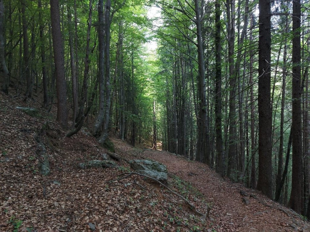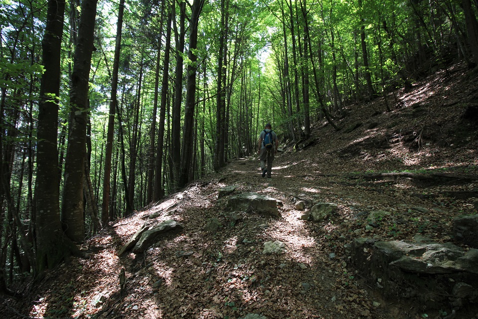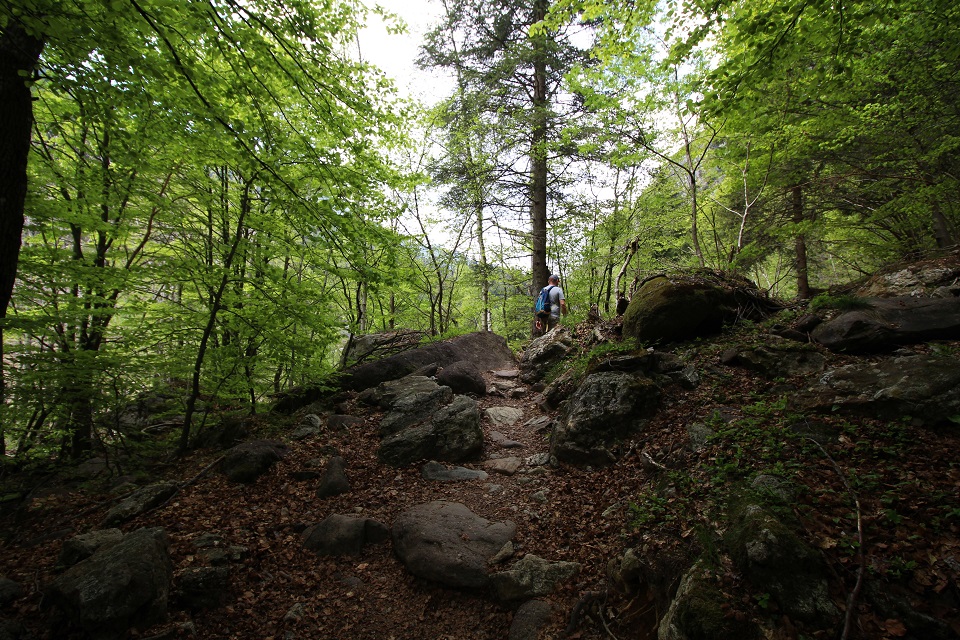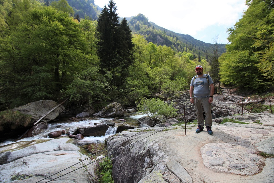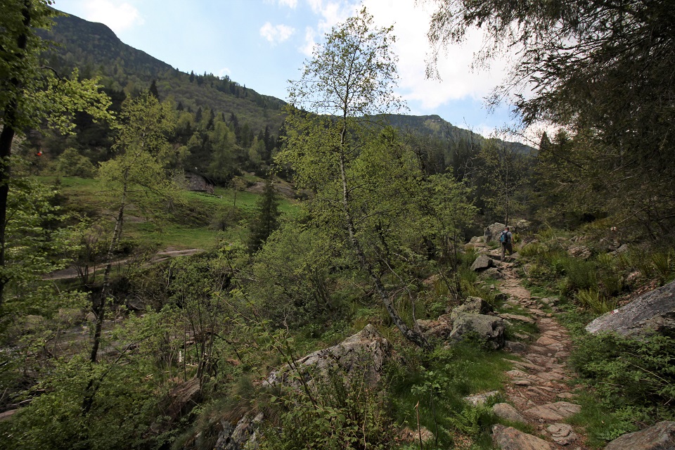 Si seguono dunque le indicazioni per il sentiero che conduce sotto la centrale, qui si supera il ponte sopra il torrente Goglio. Il sentiero inizia a salire rapidamente in mezzo a un bosco ombroso, poi sfiorata la stalla del Sersen si prosegue lungo una mulattiera. Si prosegue sul sentiero che prosegue lungo il torrente che scorre dalla val Sanguigno. Si sale fino alla località delle “cascatelle” e, proseguendo tra gli alberi di faggio, si arriva al rifugio Gianpace (1331 m).