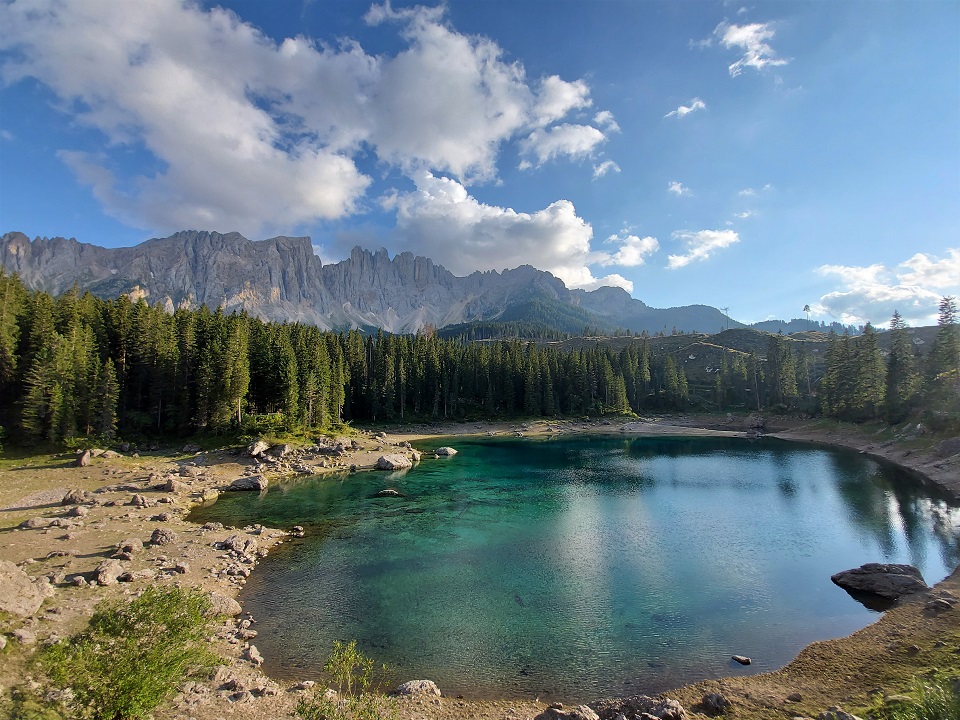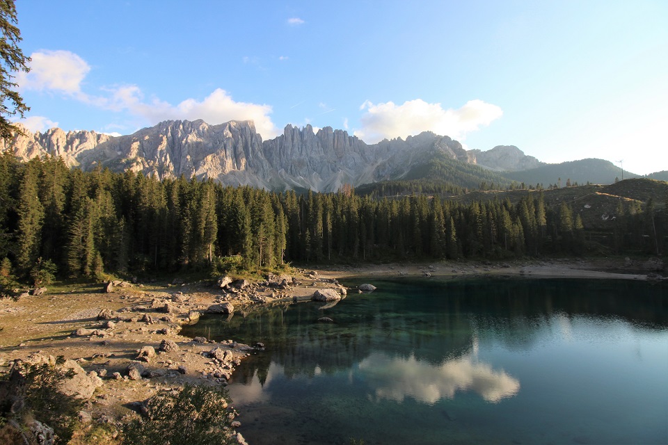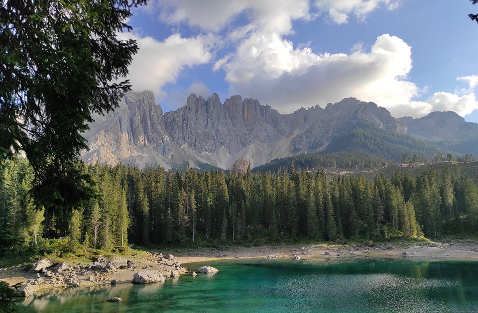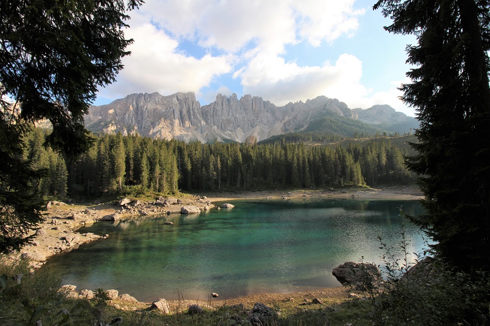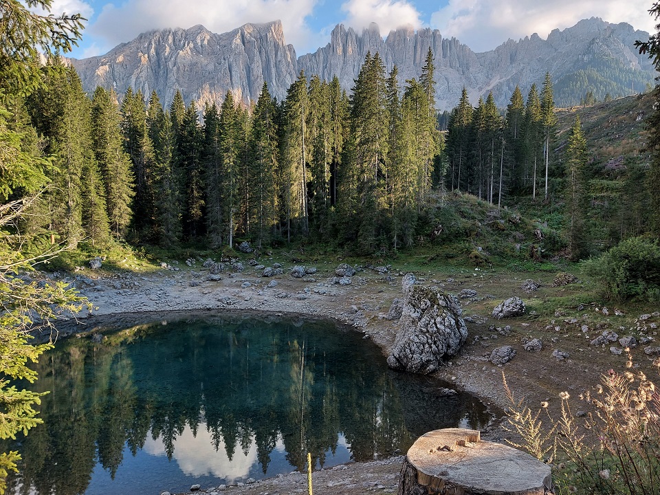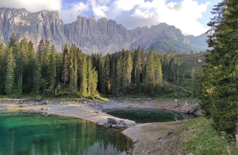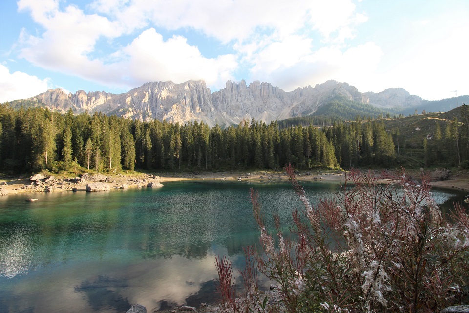 È adagiato ai piedi del massiccio del Latemar in una conca ai bordi del bosco il lago di Carezza. Lo specchio d’acqua, che si trova a 1.502 metri di altitudine, viene spesso indicato come Lec de Ergobando, lago dell’arcobaleno. Termine in cui risiede la spiegazione del nome del lago che ogni anno richiama in Val d’Ega a 6 chilometri di distanza da Nova Levante, centinaia di turisti.