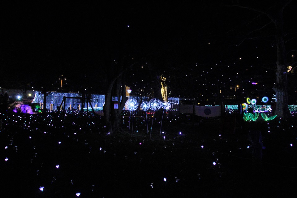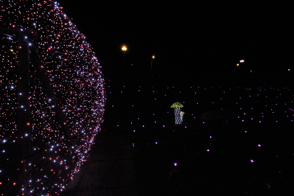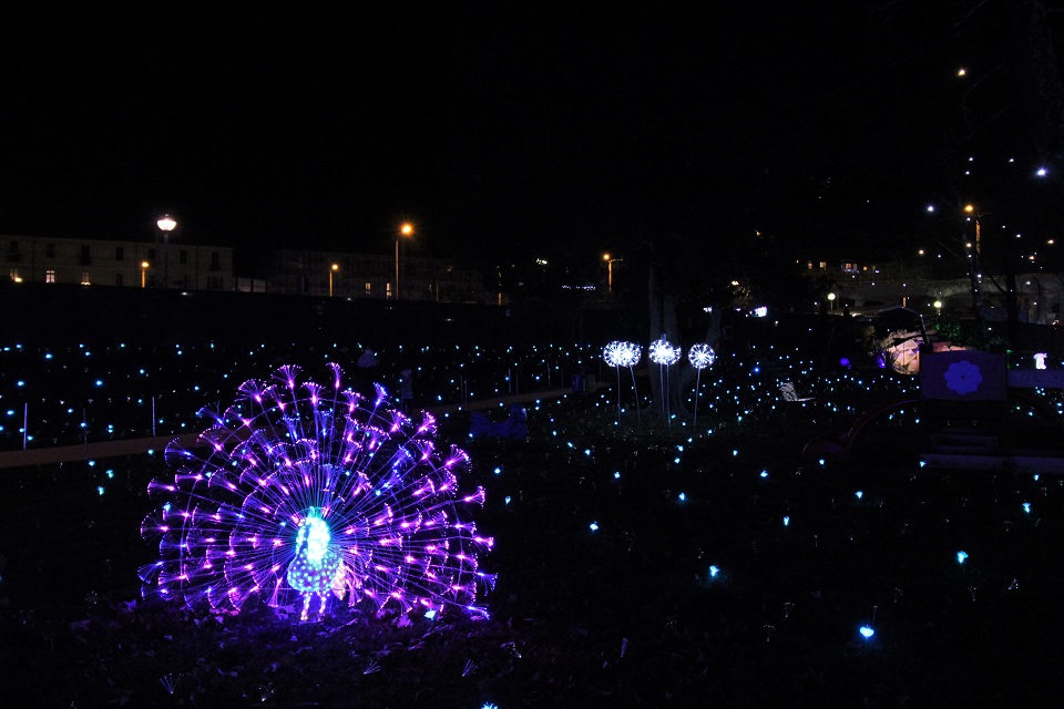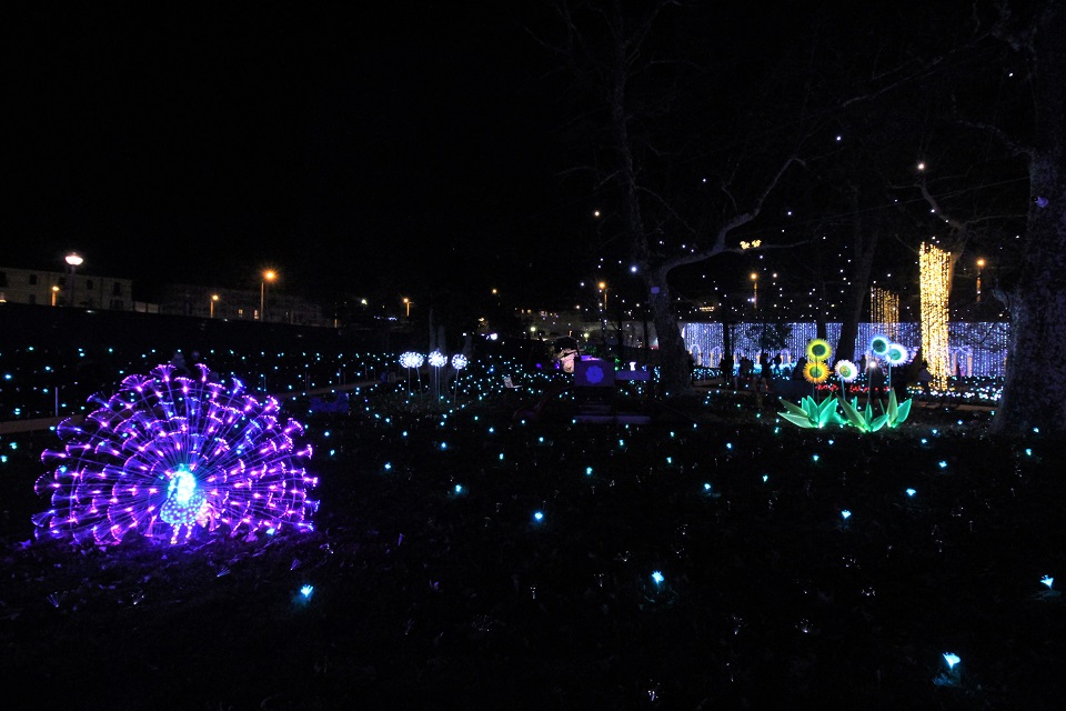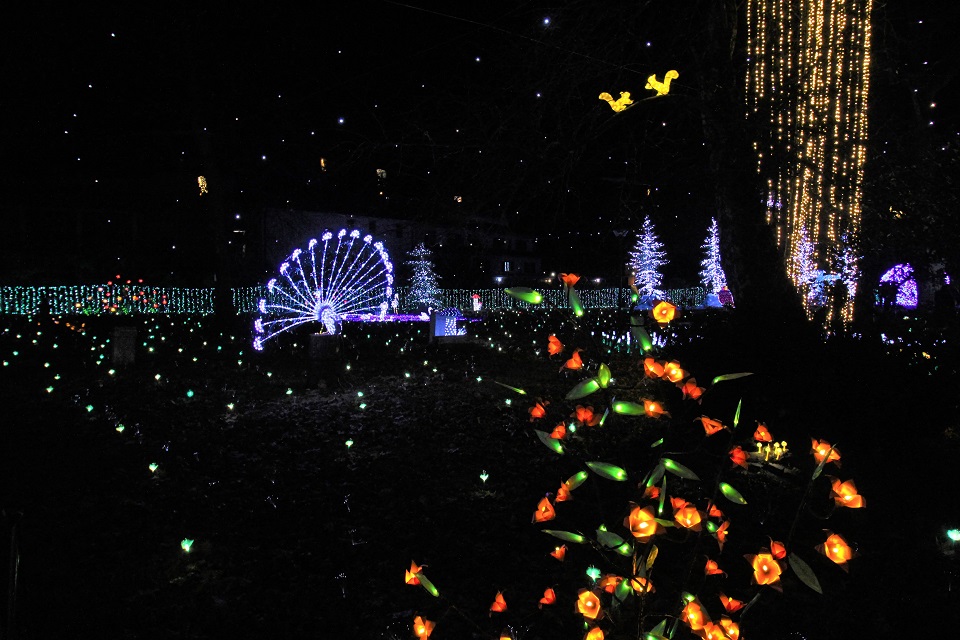 Ecco che nel parco vicino il lago si apre il percorso che si snoda tra gallerie illuminate, installazioni giocose e cascate di luci. Mentre i prati sono ricoperti da fiori dai colori cangianti e tra gli alberi è possibile scovare animali luminosi, come gufi e scoiattoli. Con loro anche lumache, cervi e pavoni.