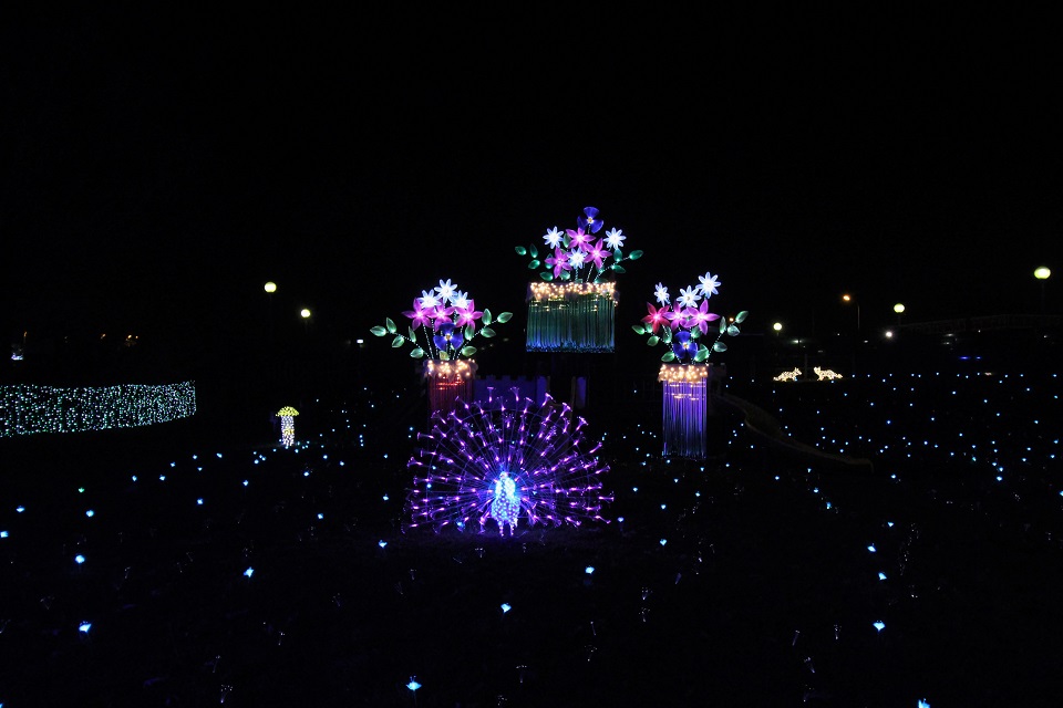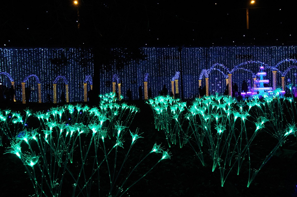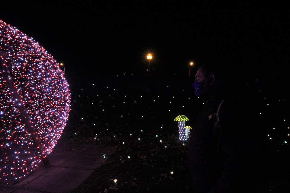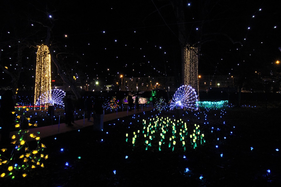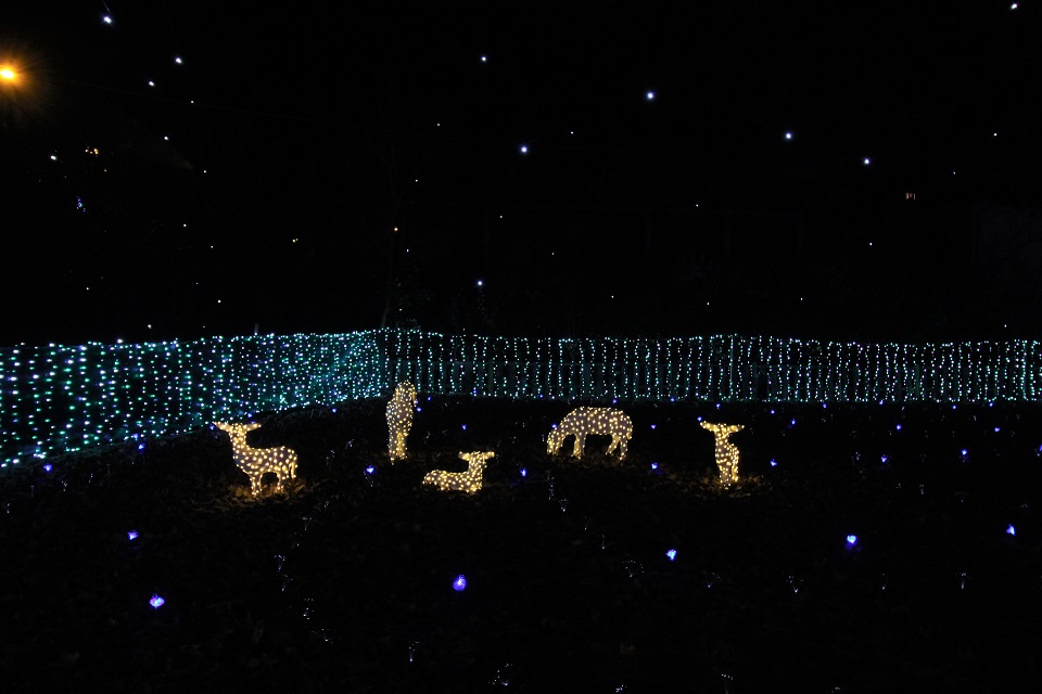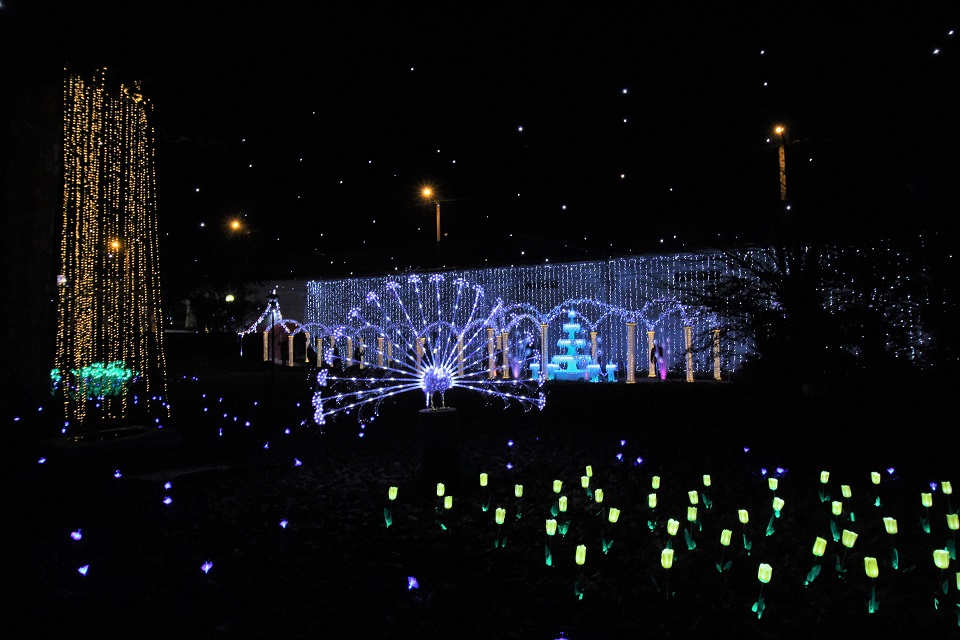 Ecco che nel parco vicino il lago si apre il percorso che si snoda tra gallerie illuminate, installazioni giocose e cascate di luci. Mentre i prati sono ricoperti da fiori dai colori cangianti e tra gli alberi è possibile scovare animali luminosi, come gufi e scoiattoli. Con loro anche lumache, cervi e pavoni.