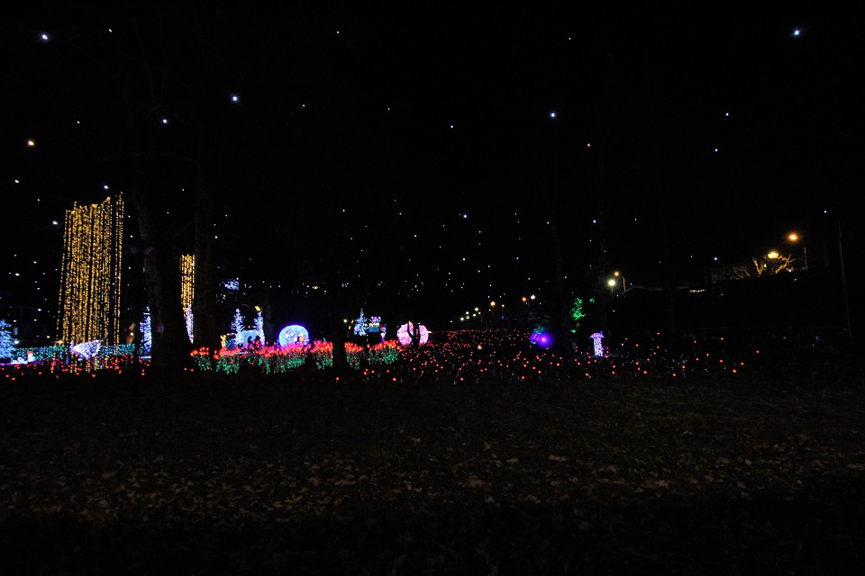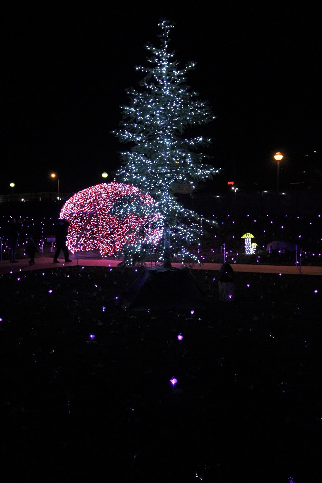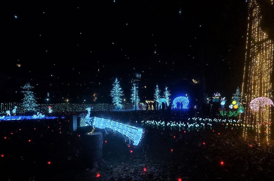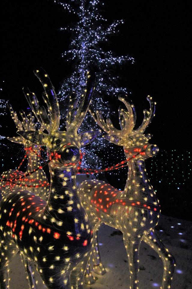 Il sentiero conduce sulla slitta di Babbo Natale e le sue renne, e accanto si trovano la grotta dagli orsi, e palle illuminate che avvolgono altalene.