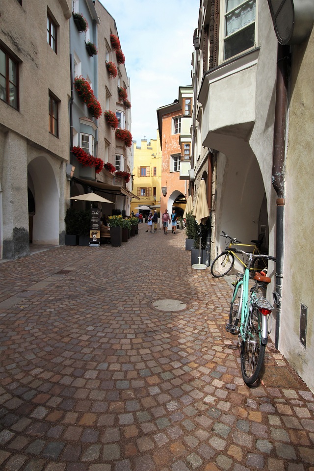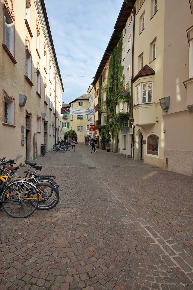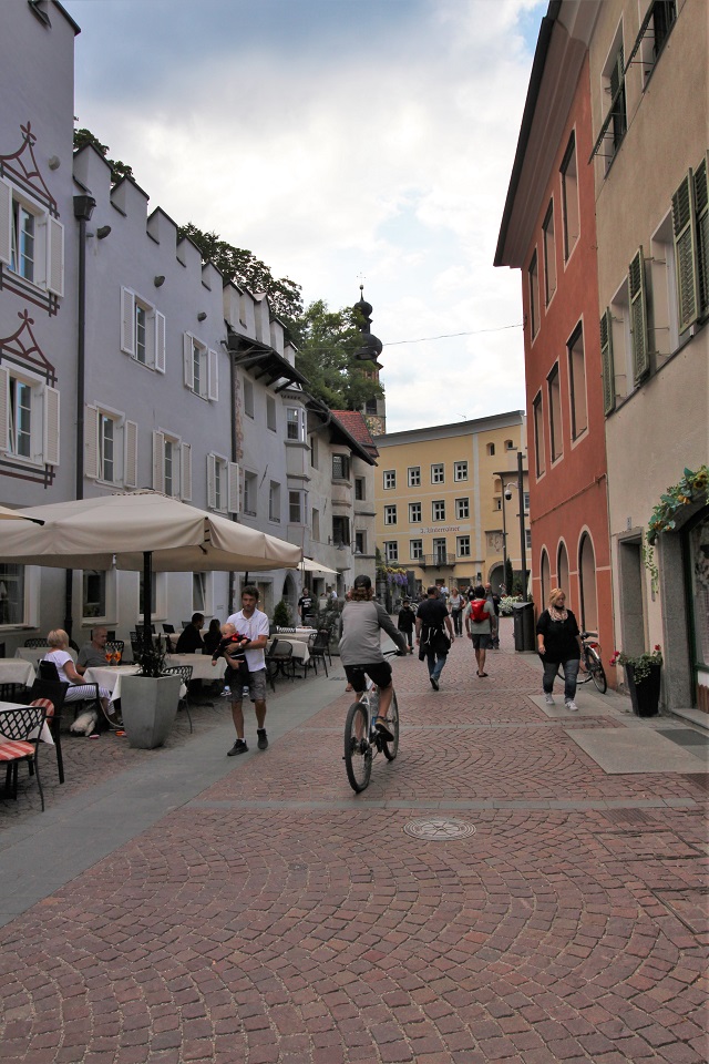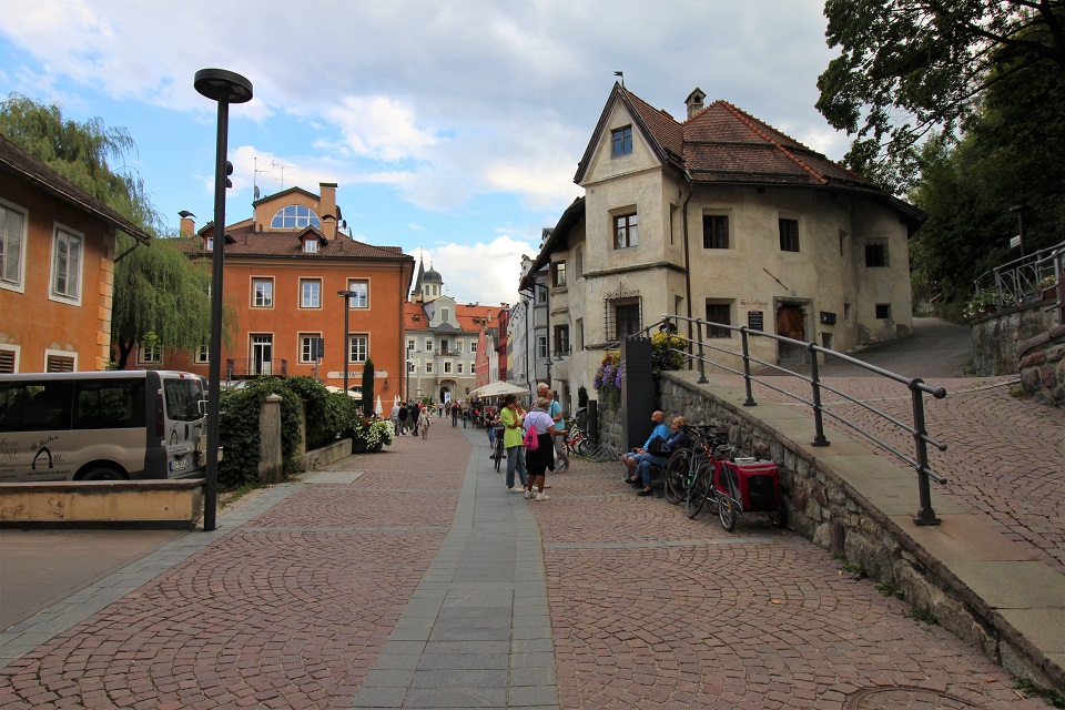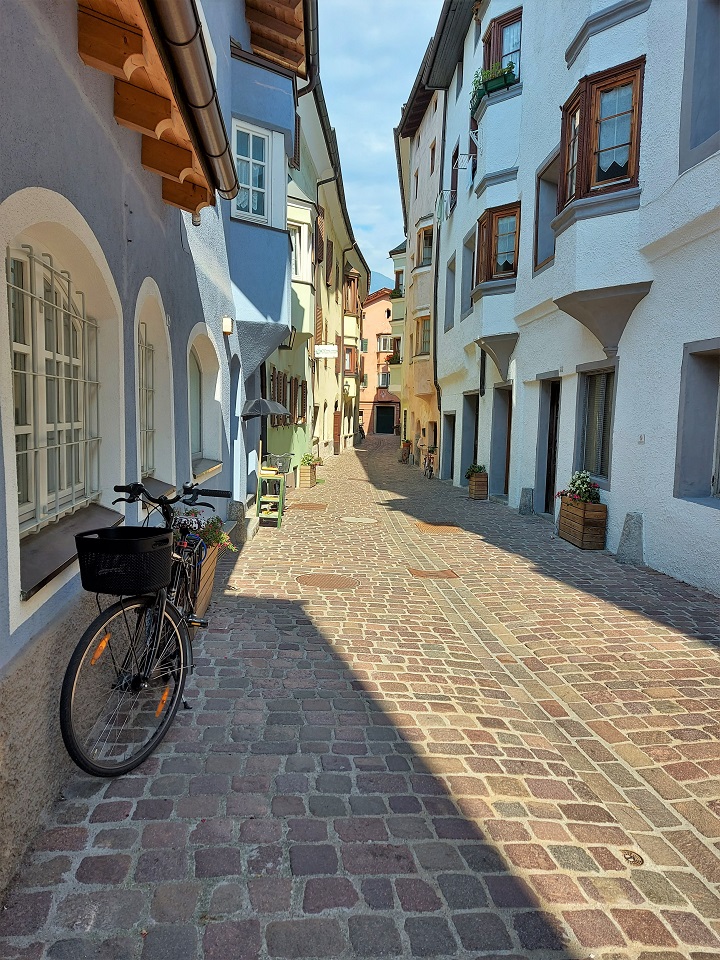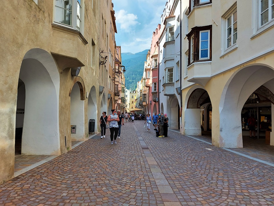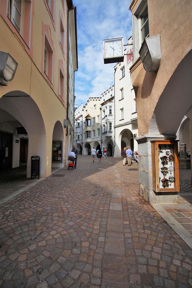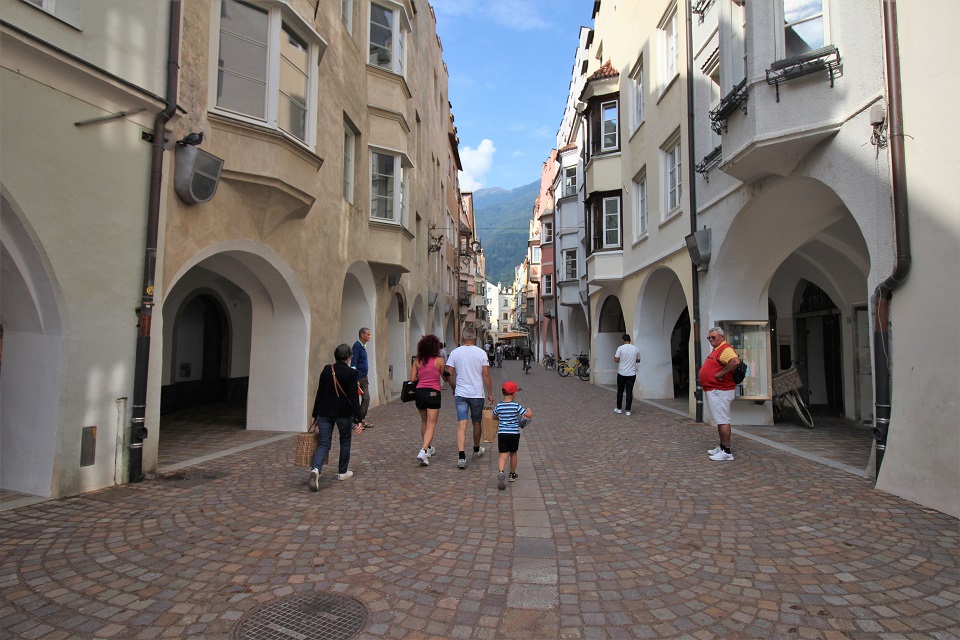 Il centro storico è invece costituito da palazzi di color pastello che si addossano uno di fianco all’altro, mentre i tipici portici altoatesini offrono riparo dal sole, dal vento e della piaggia. Tra le vie è possibile scorgere negozi e botteghe, ma anche biciclette. Le vie principali in cui perdersi sono: via dei Portici Maggiori e via Sant’Albuino.