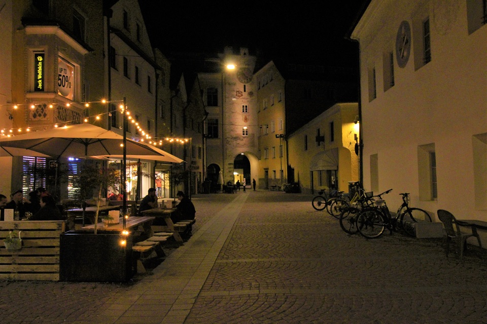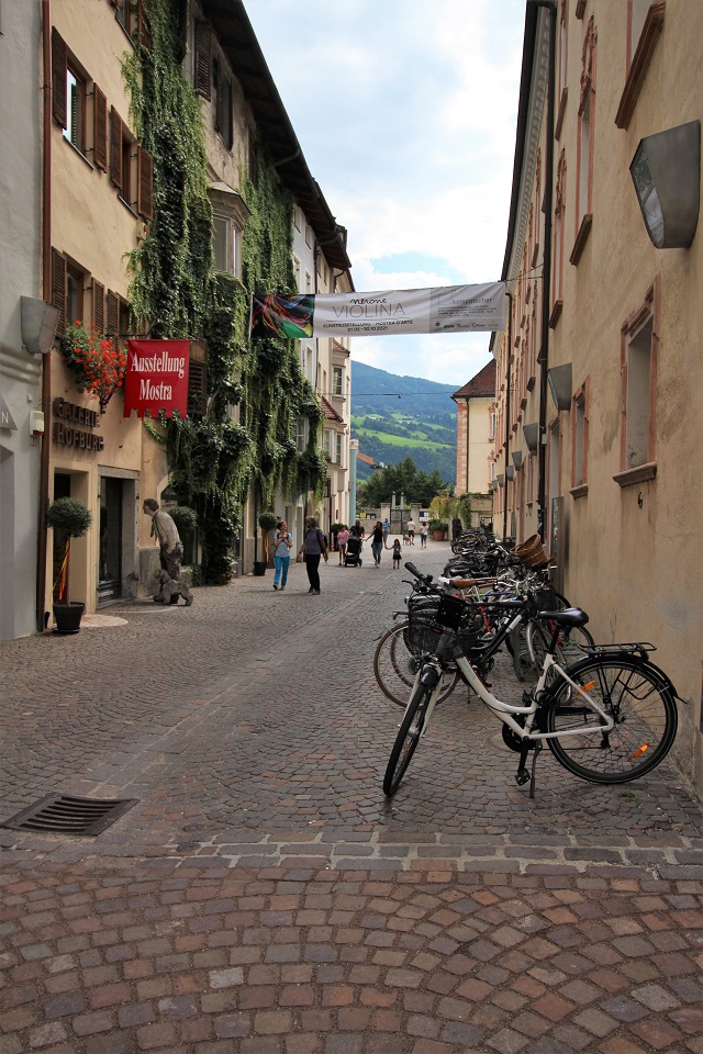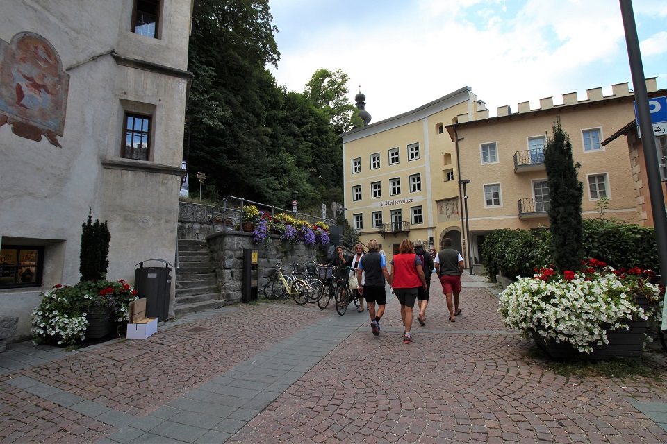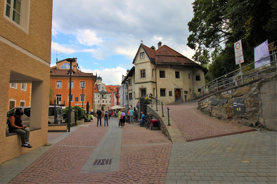 L’itinerario parte dalla chiesa delle Orsoline che, eretta agli inizi del XV secolo in stile gotico, vive addossata alle mura della città. Il campanile era infatti parte integrante delle strutture difensive. Subito al lato si trova la porta delle Orsoline, uno dei varchi per entrare nella cittadina e che porta alla Stadtgasse. Questa strada conduce fino a porta Ragen, dove si trova l’affresco della Madonna con Bambino attribuito a Friedrich Pacher, ma lungo tutta la strada principale è possibile osservare edifici ricchi di cornici affrescate. Si prosegue oltrepassando la porta e si entra in un’altra via dominata da Palazzo Sternbach.