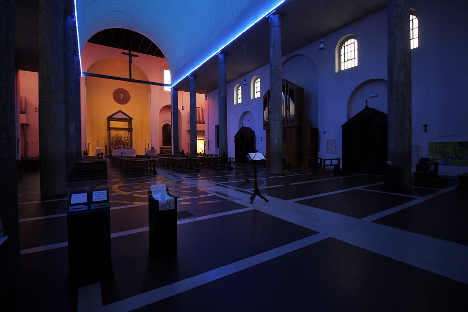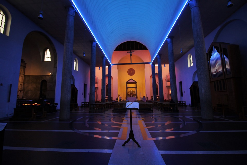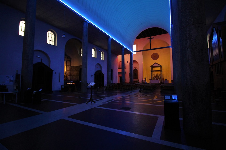 Blu, verde, rosso e oro sono invece i colori dei neon posizionati nella chiesa di Santa Maria Annunciata in Chiesa Rossa. La struttura, che si trova in via Montegani nel popoloso quartiere di Chiesa rossa realizzato negli anni Settanta, custodisce infatti l’opera dell’artista americano Dan Flavin. È il 1996 quando il parroco della chiesa, Giulio Greco, ha chiesto un intervento di site specific, poi realizzato postumo grazie a Fondazione Prada con la collaborazione del Dia Center for the Arts di New York e del Dan Flavin Estate. Da allora le navate, il transetto e l’abside si colorano rispettivamente di blu e verde, rosso e oro.