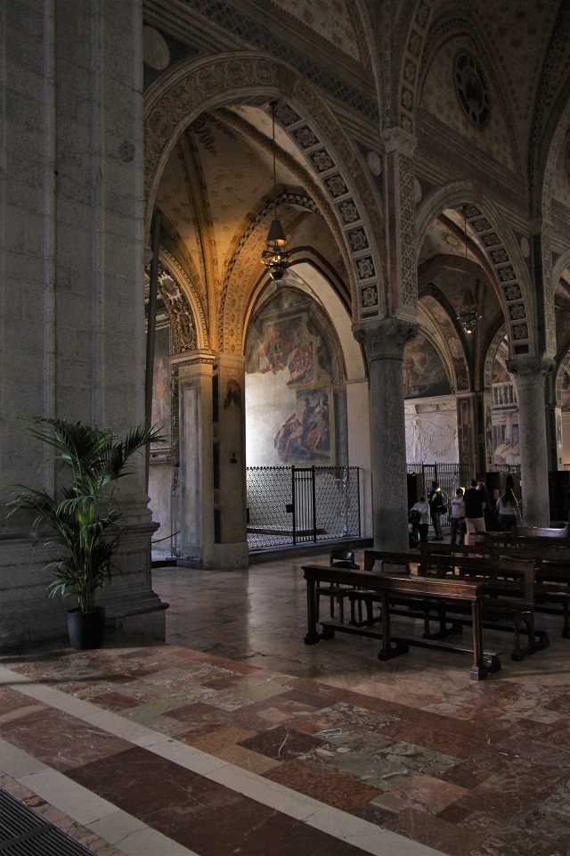 Il tour prosegue verso piazza Santo Stefano dove si trova la chiesa di San Bernardino alle Ossa. L’edificio conosciuto per la cappella ossario, le cui pareti sono ricoperte da ossa, tali da formare vere e proprie decorazioni.