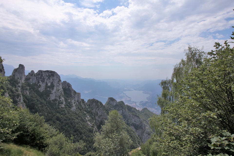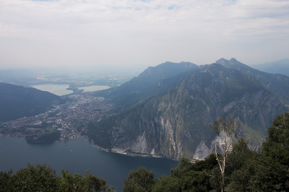 La piattaforma in ferro a sbalzo permette di affacciarsi sul lago e nelle giornate limpide da la possibilità di vedere la Brianza, i laghi di Garlate e Arnone, il Monte Barro, i corni di Canzo e la Val Brona.