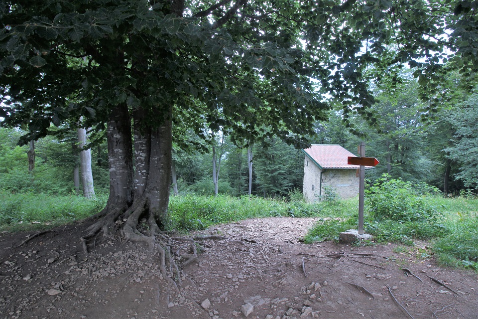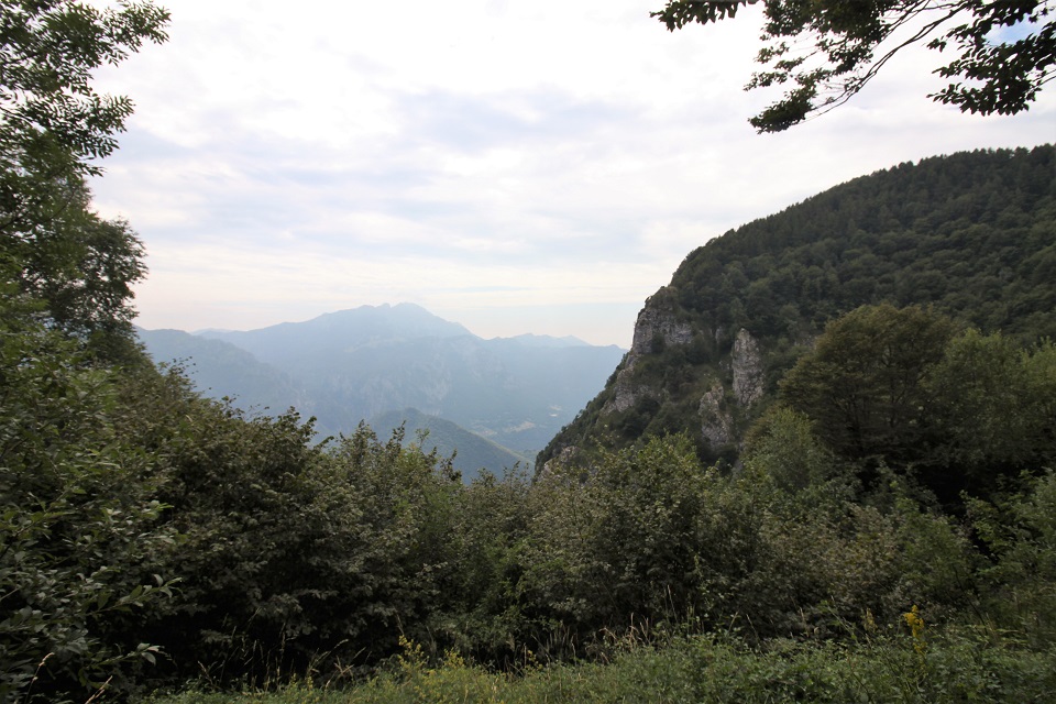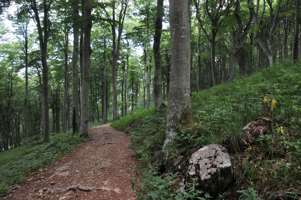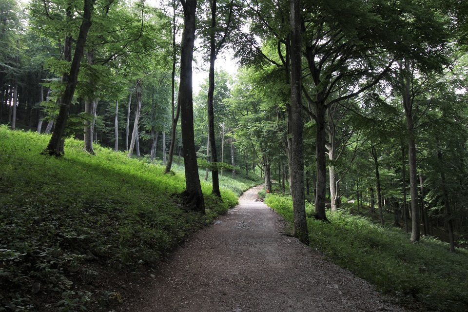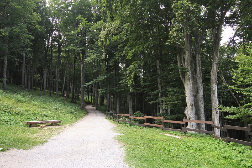 La larga mulattiera attraversa poi un bosco di faggi e frassini, e il suo sottobosco di crocus in fiore. Seguendo il sentiero sterrato in lieve pendenza e con un dislivello di circa 200 metri, si arriva al punto panoramico.