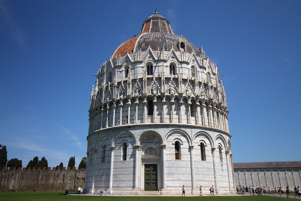 È invece dedicato a San Giovanni Battista il Battistero. E si tratta del Battistero più grande d’Italia con i suoi 107, 25 metri di circonferenza. La costruzione è iniziata nel 1153 dal Diotisalvi ed è stata completata, dopo ben un secolo, da Nicola e Giovanni Pisano. Interrotta molte volte per mancanza di denaro, la costruzione dell’opera è proseguita con l’uso di materiali diversi, in particolare per la cupola che conta tegole rosse e lastre di piombo.